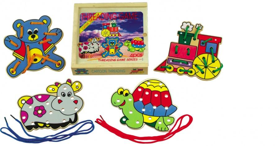 Развлекательный комплект состоит из четырех разноцветных деревянных фигурок, выполненных в форме медвежонка, коровки, паровозика и черепашки, также его дополняют четыре прочных шнурка синего, красного, желтого и зеленого цветов.